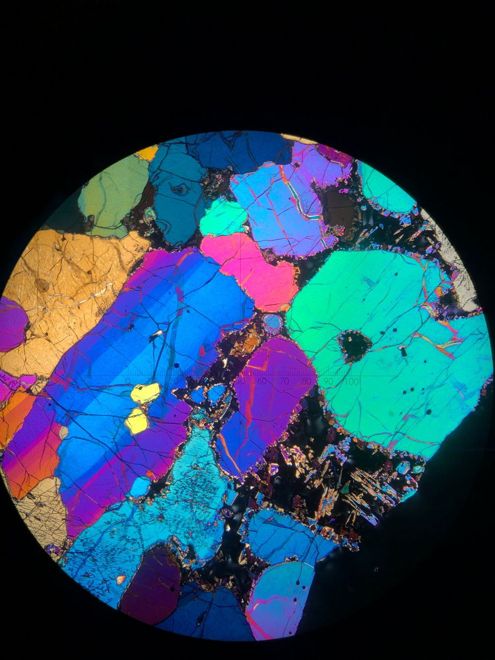 In the photo below, you can see how cross-polarised light passing through the mantle rock reveals a mosaic of colourful crystals. The darker part is the enclosing volcanic rock.